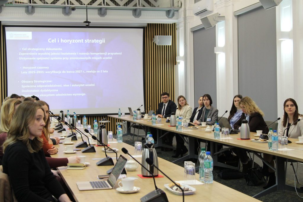 16 lutego 2026 roku doktorant naszego Wydziału, Michał Winczek – przewodniczący Warszawskiego Forum Doktorantów –  wraz z reprezentowaną przez siebie organizacją wziął udział w konsultacjach dotyczących Strategii Rozwoju Szkolnictwa Wyższego w Ministerstwie Nauki i Szkolnictwa Wyższego.
